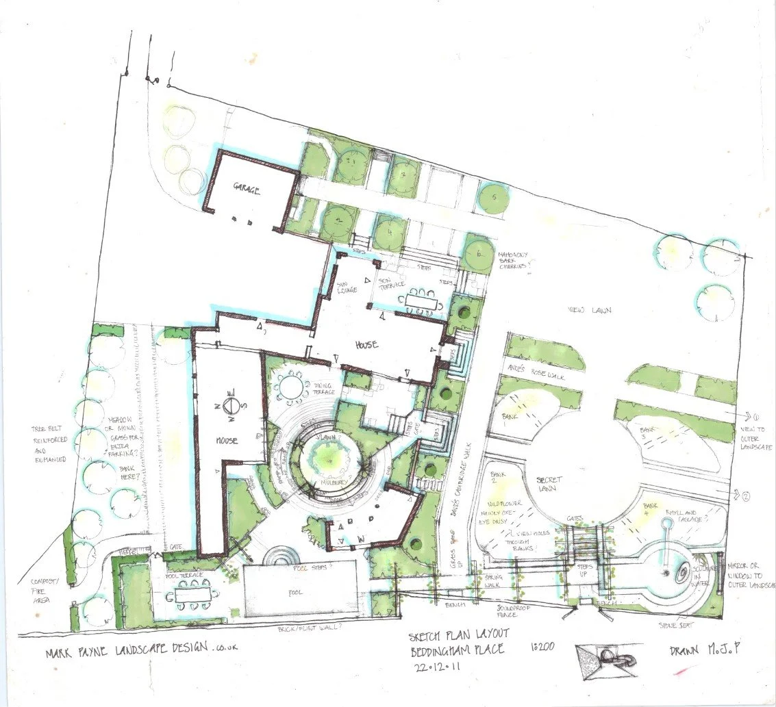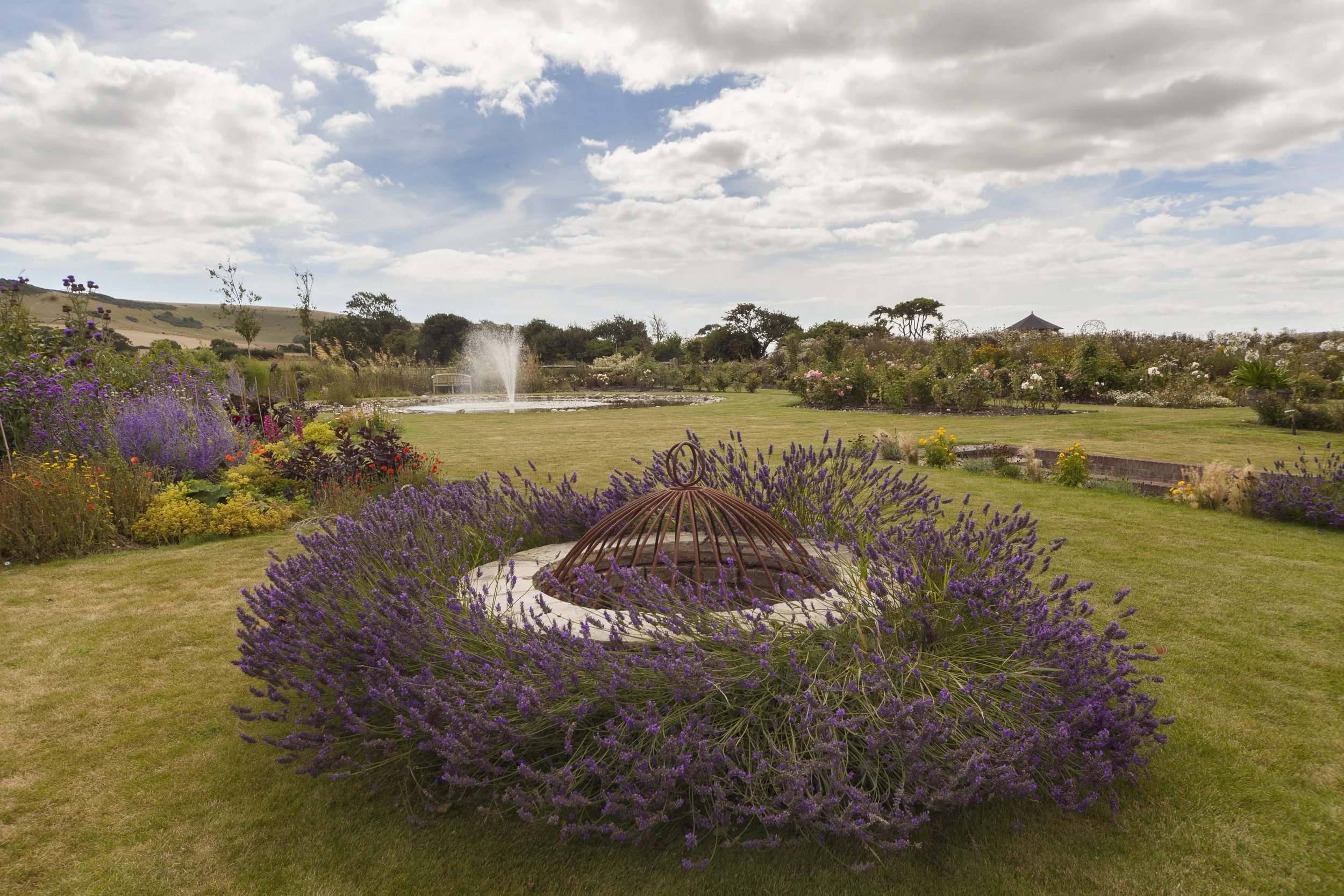 Critical to the design would be the creation of intimate space whilst framing the incredible views. A circular motif is echoed throughout the garden. In the radial steps of the walled courtyard garden, the generously proportioned iris lined pond, the raised wildflower banks of the children’s spiral maze as well as the contemporary edge of designer Alex Moore’s corten steel sculptural spheres.